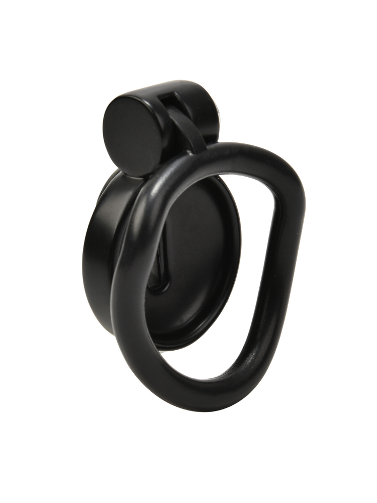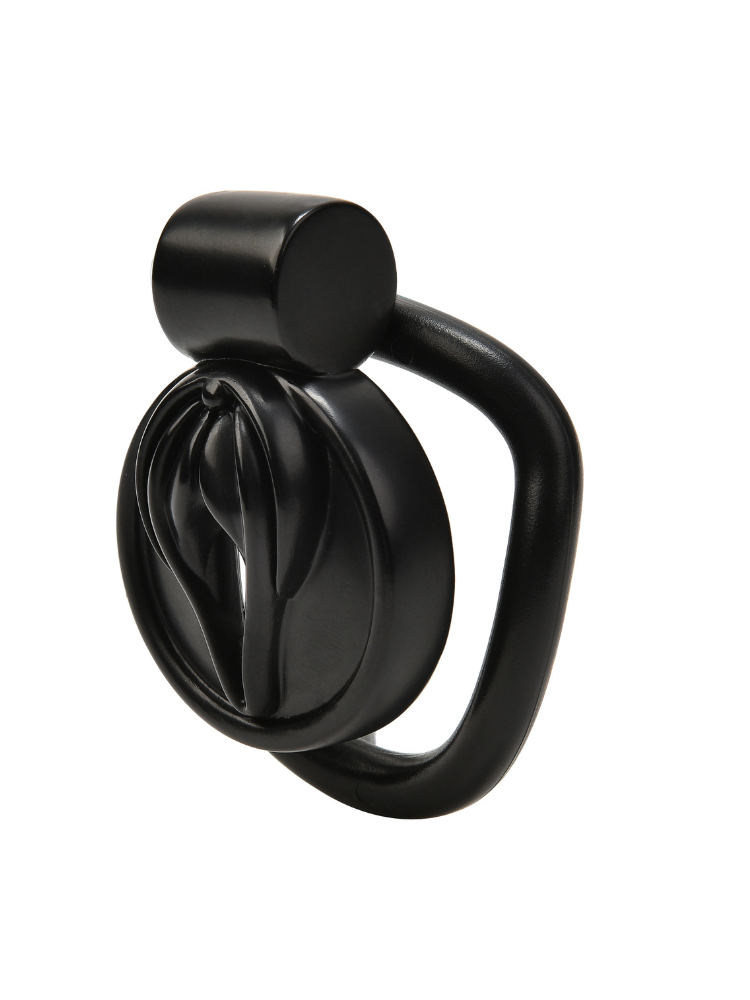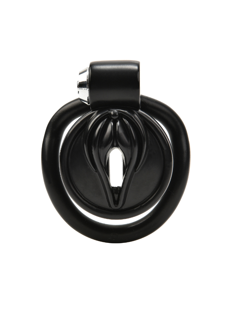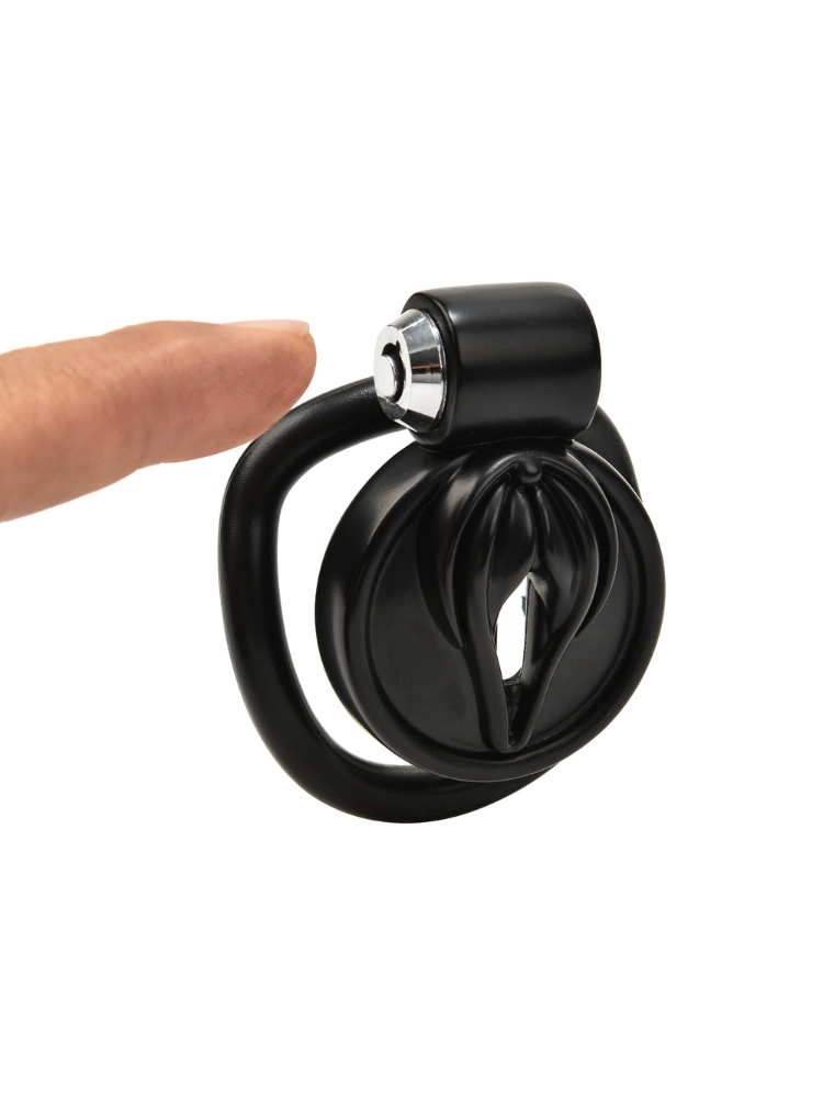 Crafted from smooth, body-safe metal with a matte black finish, this chastity cage features a “plug hole” style front — curved inward and punctuated with multiple ventilation holes for comfort, hygiene, and a constant visual reminder of your locked-up state. The narrow slit allows for urination but nothing more, making it ideal for extended wear, public chastity, or strict Dom/sub arrangements.