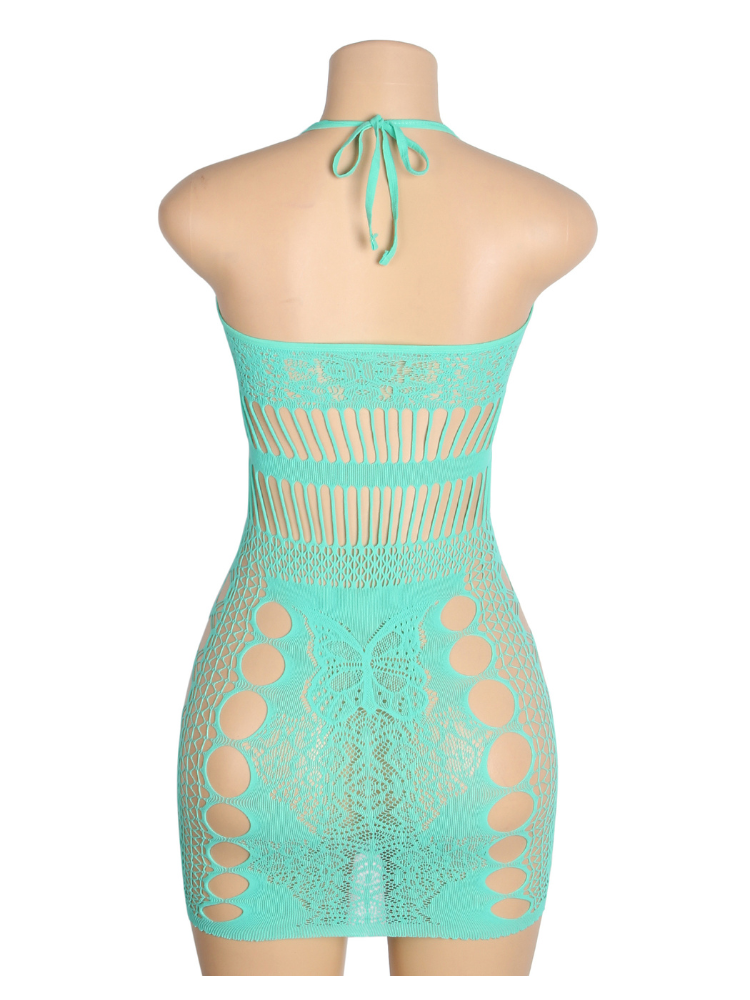 The Cyan Halter Bodystocking Dress is a lingerie dream in bold colour and intricate detail. With an eye-catching butterfly jacquard front and seductive oval cut-outs along the hips, this piece sculpts your body in all the right places while letting your curves play peekaboo. The halter neck ties gently behind the neck, giving you a customizable fit and flattering lift across the bust and shoulders. Down the back, vertical slashes and open weaves create a visual tease that draws the eye and sets the tone—whether it’s for private seduction or playful exhibition.