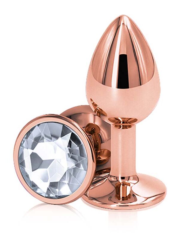 - Elegant rose gold metal butt plug with sparkling faux jewel