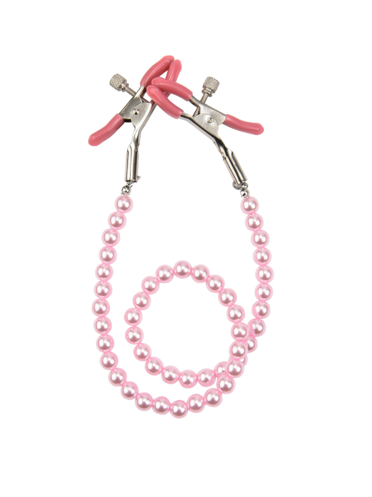 Add a touch of glamour to your bondage or sensation play with these adjustable nipple clamps adorned with a beautiful string of pink pearl beads. Whether you’re dressing up for your dominant or indulging in a luxurious solo session, these clamps offer both beauty and bite. The sleek metal clamps are tipped with soft pink rubber for comfort and grip, while the tension screw allows you to fine-tune the pressure to your exact preference—from gentle to intense. The pearls sway with movement, adding visual allure and subtle weight for extra stimulation.