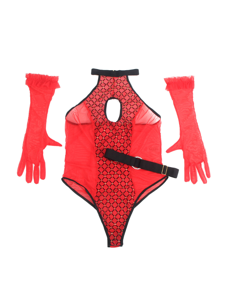 Ready to make an entrance no one forgets? This red flocked mesh halter bodysuit is pure high-impact seduction with a luxe, fashion-forward twist. Crafted from sheer scarlet mesh, this piece clings like a second skin while revealing just enough to keep imaginations racing. The velvet-style flocked lattice pattern adds rich texture and visual depth, while the high halter neckline frames your shoulders and draws the eye to the daring circular keyhole cut-out at the chest. The waist is cinched with a bold elastic belt finished with a sparkling buckle detail, sculpting your curves and creating that irresistible hourglass shape. Down below, the open crotch design invites hands-on exploration and keeps things effortless when the mood shifts from teasing to taking charge. And because drama is in the details, this set includes matching sheer red gloves — perfect for slow reveals, sensual touch, and a little burlesque-inspired flair.